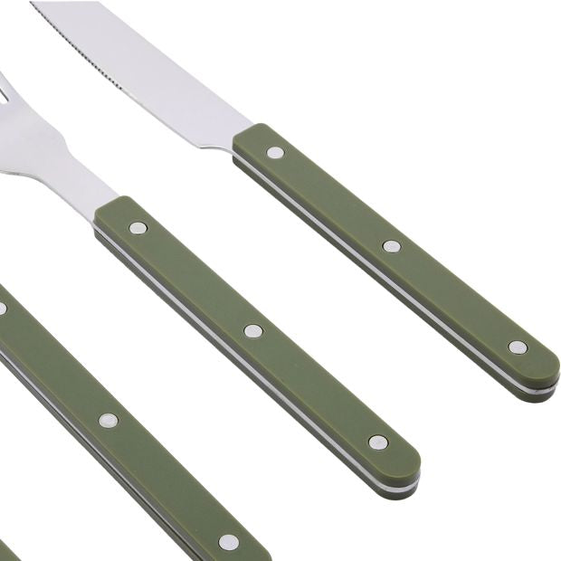 Product DetailsIncludes 4 x knives, 4 x forks, 4 x spoons and 4 x teaspoons16 piecesDimensions/Size:Teaspoon: 16.8cm (H) x 3cm (W) x 1.9cm (D)Spoon: 20.7cm (H) x 4.2cm (W) x 2.5cm (D) Fork: 20.8cm (H) x 2.5cm (W) X 2.5cm (D) Knife: 22.5cm (H) x 1.8cm (W) x 0.8cm (D) Colour: Silver and greenFeaturesDishwasher safe4 place settings