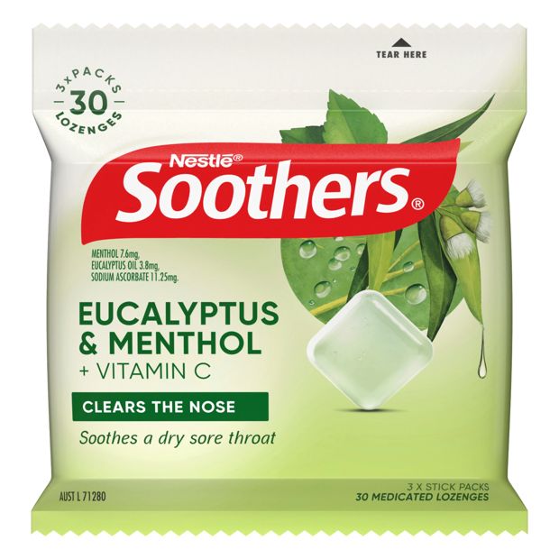 Soothers Eucalyptus & Menthol medicated throat lozenges contain active ingredients: Menthol, Eucalyptus Oil and Vitamin C to soothe the throat and clear the nose. They help relieve symptoms of common colds and flu, including coughs, dry and irritated throats and nasal congestion. Soothers Eucalyptus & Menthol throat lozenges contain no artificial colours and are proudly made in Australia. Each convenient stick pack contains thirty individually wrapped lozenges packed in three sticks of ten, perfect to take on the go.