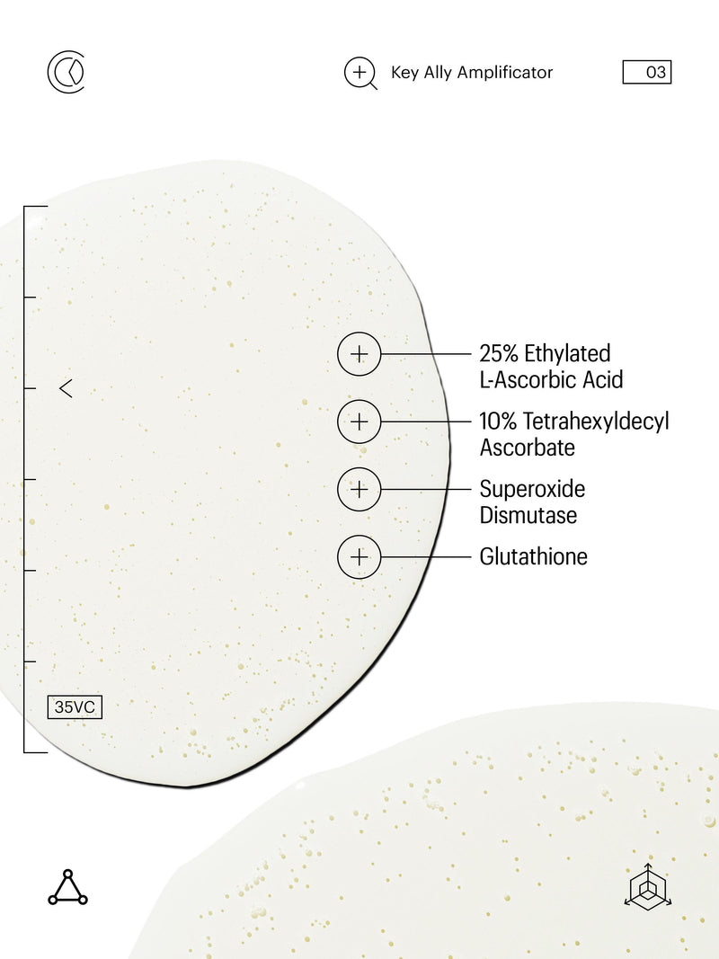 25% Ethylated L-Ascorbic Acid: A newer, more stable form of Vitamin C. Fades imperfections, boosts collagen production, and provides excellent photoprotection underneath sunscreen.. 10% Tetrahexyldecyl Ascorbate: An oil-soluble form of Vitamin C that can better penetrate the skin’s epidermis, getting to the deepest skin layers. It combats free radicals, protecting the skin from harmful environmental aggressors like UV rays and pollution.. Superoxide Dismutase: A potent antioxidant that supports the skin’s natural production of superoxide dismutase to prevent the formation of free radicals. Evens out complexion, and combats signs of premature ageing and dullness.. Glutathione: A potent antioxidant that helps target photoageing, battles oxidative stress, and reduces the concerns associated with exposure to free radicals. Leaves the skin looking clearer, firmer and more even.