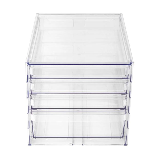 Product DetailsIncludes 1 x large drawer and 3 x small drawersDimensions/Size: 34cm (H) x 25.5cm (W) x 23.3cm (D)Product weight: 2.68kgColour: ClearFeaturesA4 size drawers