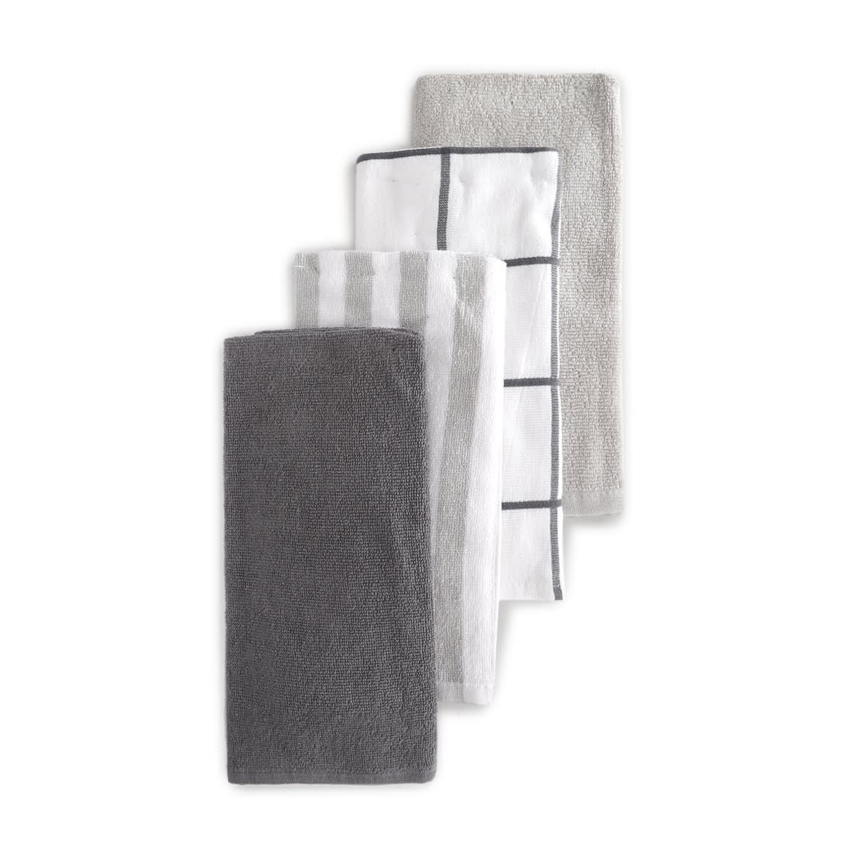 Hold a hot kettle, dry your washed dishes or wipe your hands while cooking with these Grey Linear Terry Tea Towels.