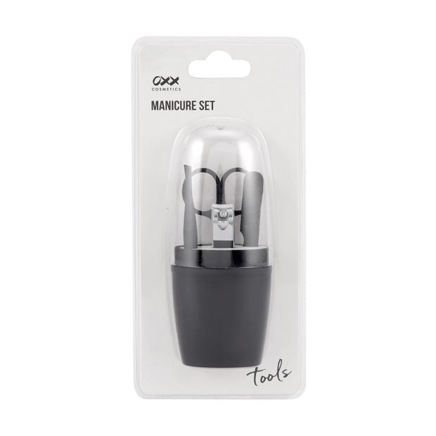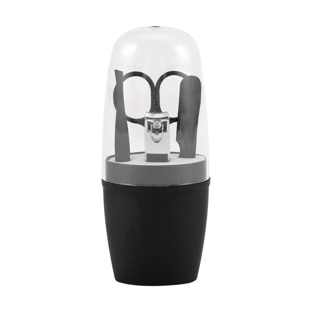 Product DetailsIncludes 1 x tweezers, 1 x scissors, 1 x nail clippers and 1 x nail file4 piecesDimensions/Size:Scissors: 9.1cm (H) x 3.9cm (W) x 0.2cm (D)Nail clipper: 5.3cm (H) x 1.2cm (W) x 1.3cm (D)Eyebrow Tweezer: 8.7cm (H) x 0.7cm (W) x 0.5cm (D)Steel file: 9.8cm (H) x 1cm (W) x 0.07cm (D)Material:Scissors: Zinc alloyNail clipper: Carbon steelEyebrow tweezer and steel file: Stainless steelBase: Acrylonitrile butadiene styrene (ABS)Sponge: Ethylene vinyl acetate (EVA)Clear lid: Polystyrene (PS)Colour: Black