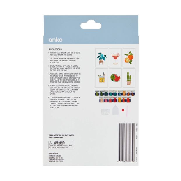 Product DetailsIncludes 6 x canvas print design, 16 x coloured gems packs and tool set6 piecesDimensions/Size:Canvas print design: 15.24cm (H) x 10.16cm (W) / 6-inch (H) x 4-inch (W)Coloured gems packs: 6.7cm (H) x 6cm (W)FeaturesNovelty food designFor DIY craftMini size