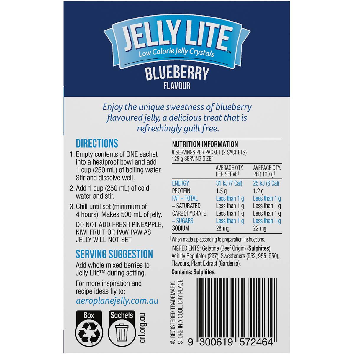 Enjoy the unique sweetness of blueberry flavoured jelly that is delicious and refreshingly guilt free. • Blueberry flavoured jelly crystals • Low in calories • Low in sugar • Delicious taste • 2 pack value - 8 servings per packet Directions 1. Empty contents of One sachet into a heatproof bowl and add 1 cup (250 mL) of boiling water. Stir and dissolve well. 2. Add 1 cup (250 mL) of cold water and stir. 3. Chill until set (minimum of 4 hours). Makes 500 mL of Jelly. Do not add fresh pineapple, kiwi fruit or paw paw as jelly will not set About Aeroplane Jelly Aeroplane Jelly has a special place in the hearts of all Australians. It could be the nostalgia you feel every time you hear that jingle or taste your favourite flavour. Or it could be because Australia's favourite jelly has been around since 1927. Our jellilicious range has blossomed since then to include Original, Jelly Lite, Naturals, Ready to Eat, and Dessert Mixes. Discover our full range today!