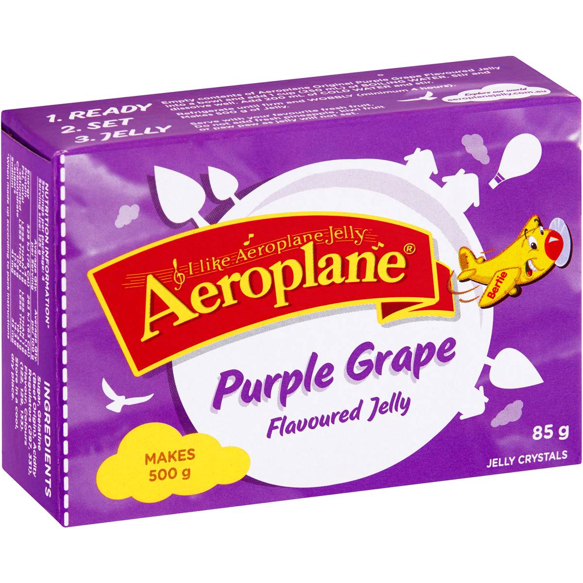 Aeroplane's Purple Grape flavoured jelly is a delicious treat for the whole family. This jelly is fun and easy to make - simply ready, set, jelly! Great on its own, served with fresh fruit, ice cream, in a trifle or jelly slice. One packet makes 500g of jelly - 4 serves per packet.