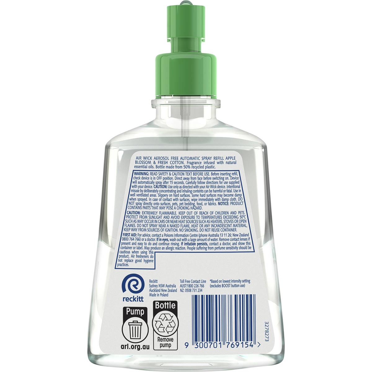 Tackle bad kitchen & bathroom odours with bursts of scents inspired by spring. Neutralise unwanted odours and immerse your senses with fragrances of apple blossom and fresh cotton.Air Wick 24/7 Odour Neutralising Automatic Spray is an aerosol-free continuous air freshener refill designed to tackle malodour within your living, kitchen & bathroom with its odour neutralising molecules to make your home smell fresh for up to 70 days*Infused with natural essential oils, Air Wick 24/7 Odour Neutralising Automatic Spray has a 95% naturally derived formula and is free from propellant & intentionally added dyes.With adjustable intensity control settings, you can choose and control the fragrance intensity. For an extra boost of freshness use the boost button at the top of the device.Both, Air Wick and Botanica by Air Wick aerosol-free automatic spray refills are compatible with Air Wick 24/7 Odour Neutralising Automatic Spray devices and are available in a variety of scents.* based on lowest intensity setting •24/7 Odour Neutralising is an effective solution to neutralise odours automatically at home•Each refill provides continuous freshness for up to 70 days* *based on lowest intensity setting (excludes BOOST button use)•Fragrance infused with natural essential oils•Aerosol-free with 95% naturally derived ingredients free from propellant & intentionally added dyes•Compatible with Air Wick and Botanica by Air Wick aerosol-free automatic spray devices