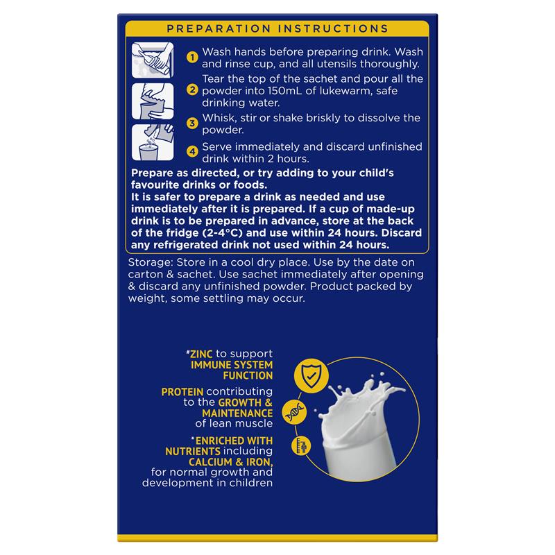 Product Claims: With prebiotics & probiotics. No added sugar, no artificial flavours, colours, preservatives. Enriched with nutrients for growth (enriched with nutrients including calcium & iron, for normal growth and development in children).