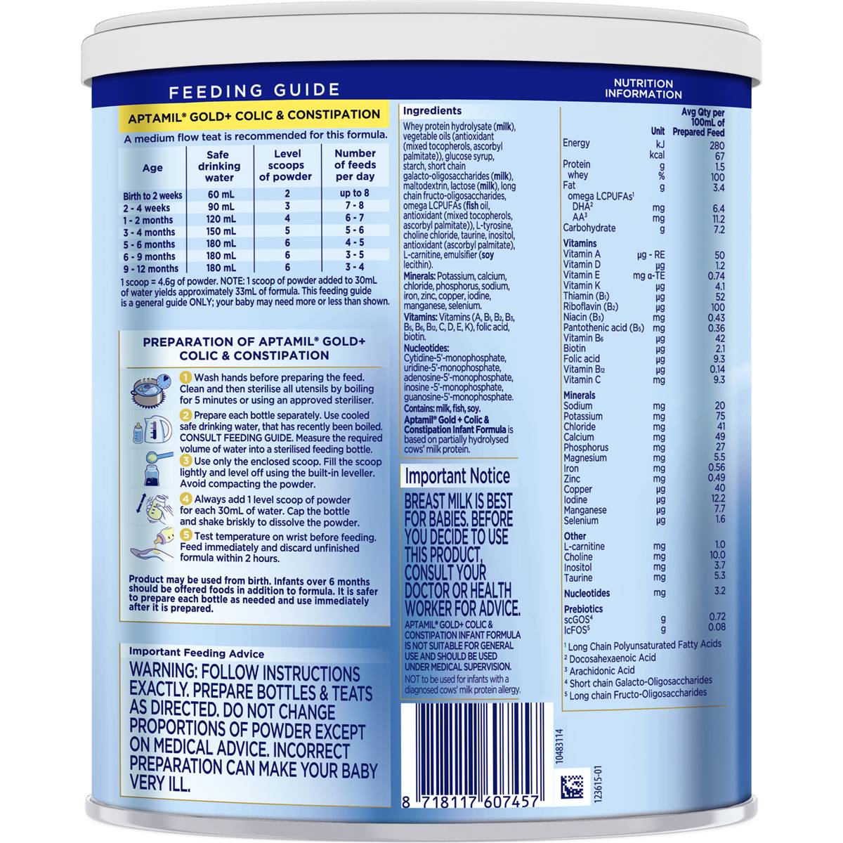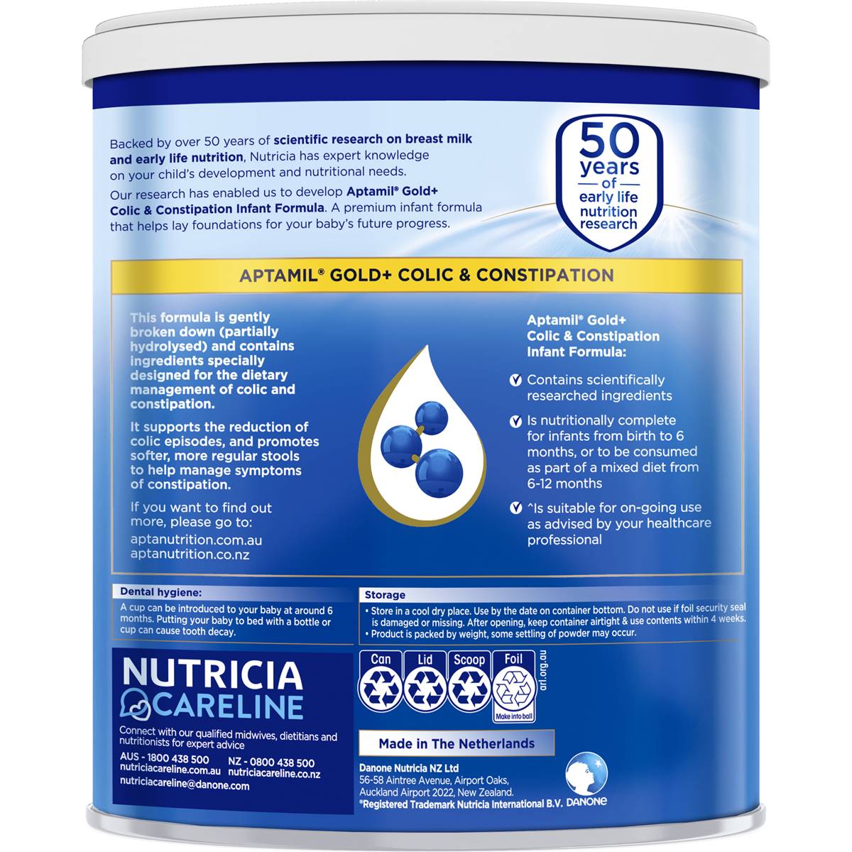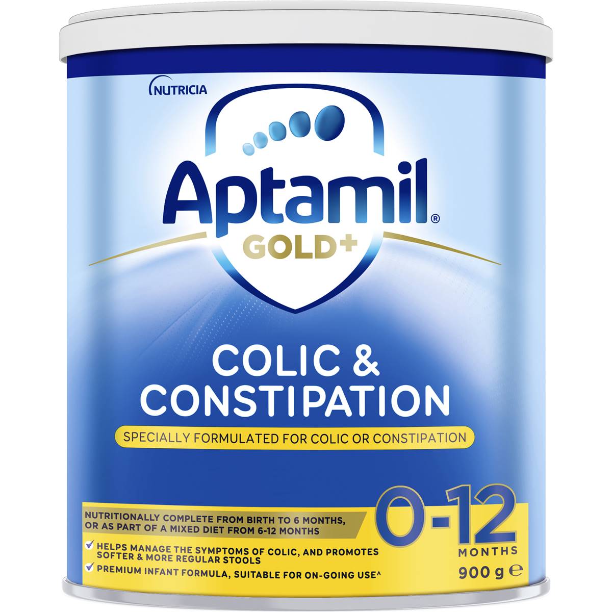 Aptamil Gold+ Colic & Constipation is a specialty infant formula designed to nutritionally support babies with colic or constipation.Broken down (partially hydrolysed) formulation Helps manage the symptoms of colic, and promotes softer and more regular stoolsNutritionally complete for babies from birth to 6 months, or as part of a mixed diet from 6-12 monthsPremium infant formula, suitable for on-going use^^As advised by your healthcare professional.Aptamil Gold+ Colic & Constipation is a premium specialty infant formula suitable for infants experiencing colic and/or constipation. Specially researched and developed, it contains ingredients to help ease symptoms, reduce episodes of colic, and encourage softer and more frequent stools.This formula is gently broken down (partially hydrolysed) and contains ingredients specially designed for the dietary management of colic and constipationSupports the reduction of colic episodes, and promotes softer, more regular stools to help manage symptoms of constipationNutritionally complete for infants aged 0 to 6 months, or suitable for infants aged 6 to 12 months as part of a mixed diet900g tin formatAptamil Gold+ Colic & Constipation is not suitable for general use and should be used under medical supervision. Not suitable for infants with confirmed cows' milk protein allergy, galactosaemia, lactose intolerance.