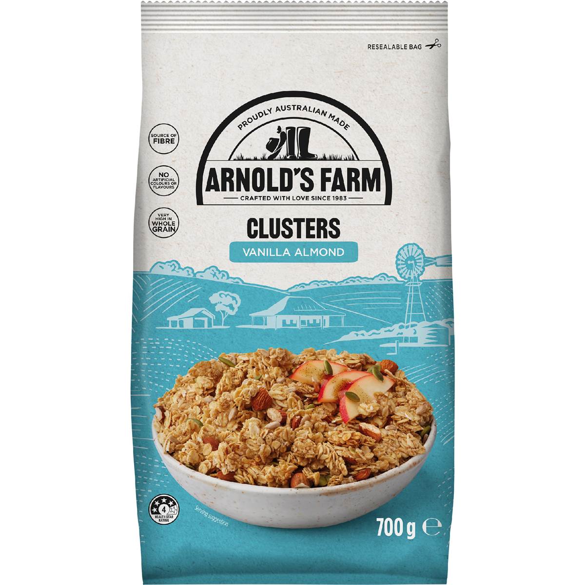 Arnold's Farm Clusters Vanilla Almond is a crispy oat clusters. Clusters of crispy Aussie oats and almonds, with sunflower seeds and pepitas baked with vanilla flavoured syrup. A source of fibre, no artificial colours or flavours and is very high in whole grain. Proudly Australian made. At Arnold's Farm, we believe that good food should be enjoyed every day. That's why we're proud that our mueslis have been loved by Aussie families since 1983!Our dedicated team use wholesome, locally grown oats and grains, the way nature intended, to create a range of mueslis, granolas and clusters that are simply delicious. - Source of fibre- Very High in Whole Grain- Made with Aussie Oats- Suitable for Vegetarians- No Artificial Colours or Flavours- One 45g serve of Arnold's Farm Vanilla Almond Clusters contributes 59% of the 48g whole grain Daily Target Intake.