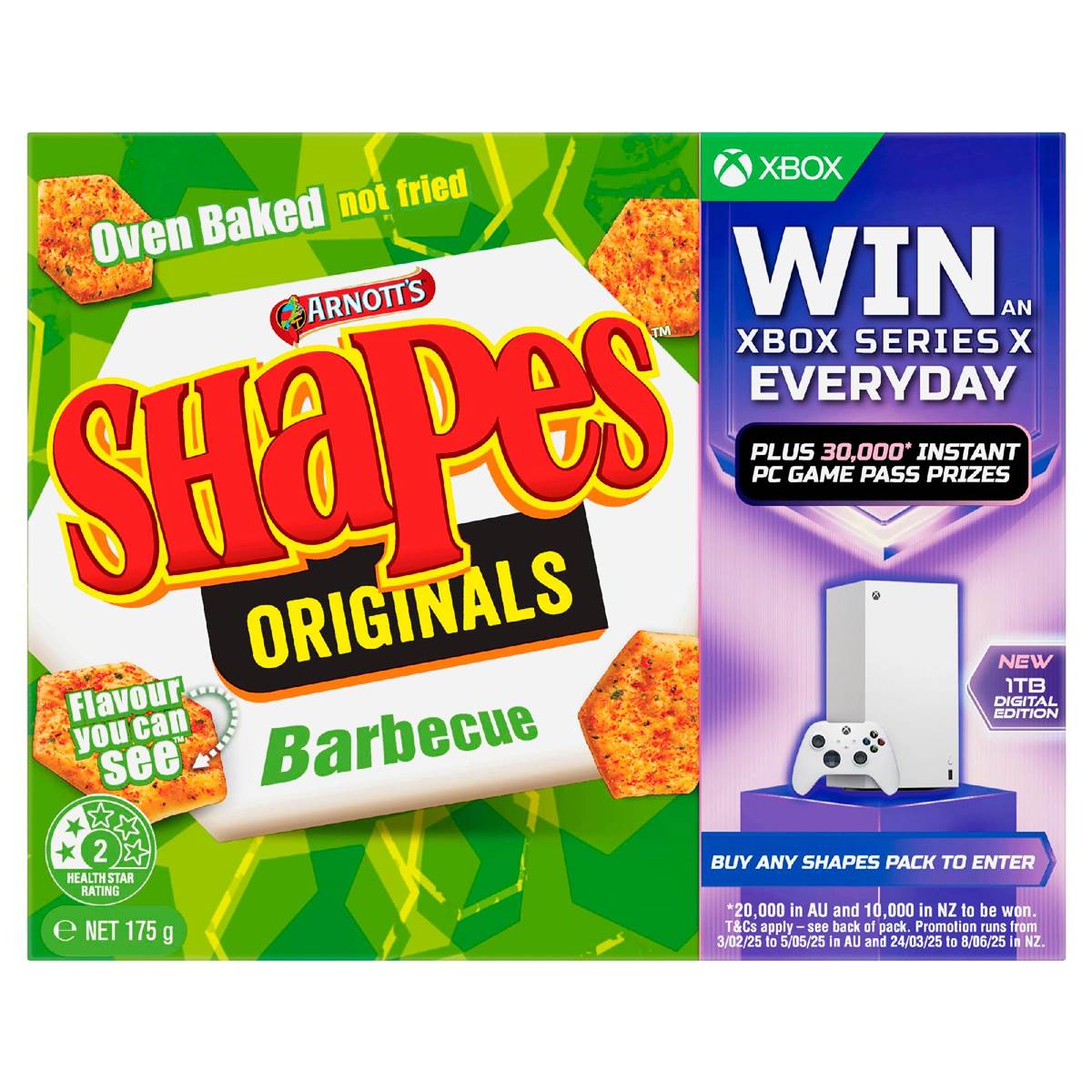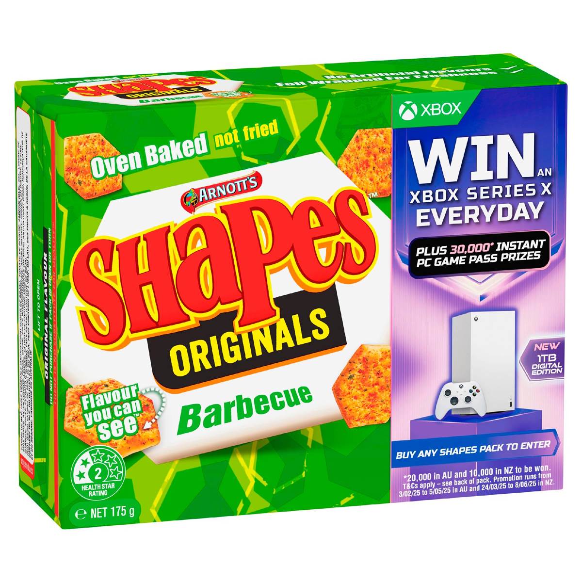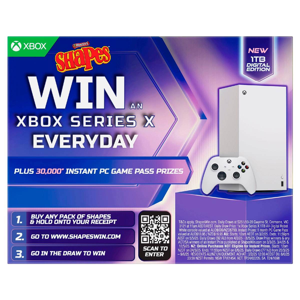 Arnott's Shapes Originals Biscuits XBOX 25 Barbecue is oven baked not fried. Flavour you can see. Win an XBOX Series X Everyday. Plus 30,000 (20,000 in AU and 10,000 in NZ to be won. T&Cs apply - see back of pack. Promotion runs from 3/02/25 to 5/05/25 in AU and 24/03/25 to 8/06/25 in NZ) Instant PC Game Pass prizes. New 1 TB Digital Edition. Buy any Shapes pack to enter. Win an XBOX Series X everydayPlus 30,000 (20,000 in AU and 10,000 in NZ to be won. T&Cs apply - see back of pack. Promotion runs from 3/02/25 to 5/05/25 in AU and 24/03/25 to 8/06/25 in NZ). Instant PC Game Pass prizes1. Buy any pack of Shapes & hold onto your receipt2. Go to www.shapeswin.com3. Go in the draw to winScan to EnterT&Cs apply, ShapesWin.com. Daily Draws at S251/10-20 Gwynne St, Cremorne, VIC 3121 at 11am AEDT/AEST. Daily Draw Prize: 1x Xbox Series X 1 TB All-Digital Robot White console valued at AUD$699/NZD$799. Instant Prizes: 1 month PC Game Pass valued at AUD$13.95/NZD$16.95 AU: Starts: 12am AEDT on 3/2/25. Ends: 11:59pm AEST on 5/5/25. Daily Draws (92 AU) from 4/2/25-6/5/25. Draw Prize winners & any ACT/SA winners of an Instant Prize published at ShapesWin.com on 3/3/25, 3/4/25 & 12/5/25. NZ: Online Purchases NOT Eligible for Instant Prizes. Starts: 12am NZDT on 24/3/25. Ends: 11:59pm NZST on 8/6/25. Daily Draws (77 NZ) from 25/3/25 - 9/6/25. Residents AU/NZ Uniquement. ACHAT: 3/2/25 12:00 AEDST DU 8/6/25 23:59 NZST Permits: NSW TP/01454. ACT. TP24/02205. SA. T24/1698