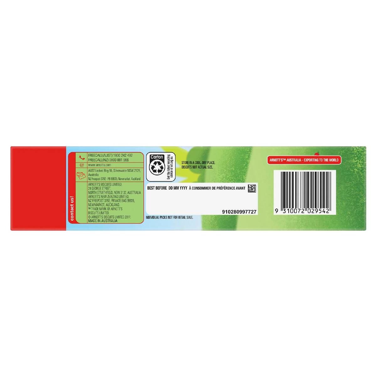 Arnott’s Tiny Teddy Hundreds & Thousands Biscuits Multipack features 8 perfectly portioned packs of sweet, colourful biscuits. Made with no artificial colours, flavours, or preservatives, these Tiny Teddies are a delightful treat for school snacks, playtime, or on-the-go snacks.A 'tip-tap, tip-tap' sound came from the roof of their house. The Teddies looked out the window to see a huge rainbow raining down Hundreds & Thousands! Arnott’s Tiny Teddy Hundreds & Thousands Biscuits bring this fun, colourful story to life in every bite. Perfect for playtime or snack time, this multipack includes 8 perfectly portioned packs of sweet biscuits, made with no artificial colours, flavours, or preservatives.Whether it’s for school snacks, lunchboxes, or an afternoon treat, these Tiny Teddies are a hit with kids and adults alike. The fun and colourful Hundreds & Thousands flavour makes these biscuits & cookies a joyful snack any time of day. Stock up on this multipack and share the magic of Tiny Teddies!• 8 convenient individual packs of Tiny Teddy Hundreds & Thousands biscuits• No artificial colours, flavours or preservatives• In a handy recyclable carton• Made in Australia• There is no substitute