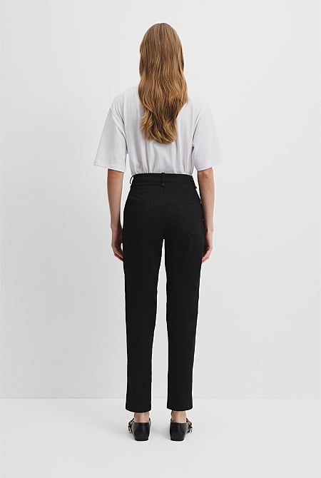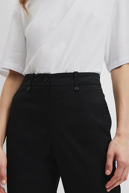 An everyday staple, this pant is made in Australian cotton twill with a hint of stretch for comfort and ease. It has a straight leg with slight tapering and a rolled cuff. Franny is 174cm tall with a 84cm bust, 64cm waist and 84cm hips and wears a size XS/8. Maria is 177cm with a 82cm bust, 61cm waist and 90cm hips and wears a size XS/S.