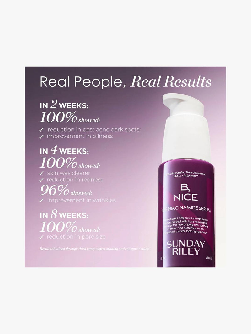 10% Niacinamide: a B3 derivative that helps the skin retain moisture, reduces the look of pores, and brightens and evens out the look of skin.. Brightenyl: a biotechnologically created molecule that's activated by the skin's microbiome to brighten the look of skin and soothe the signs of sensitivity.. Trans-resveratrol: a powerful antioxidant that neutralizes free radicals and partners with niacinamide to lighten the appearance of dark spots.. EGCG: a powerful antioxidant from green tea that fights the look of visible aging effects from pollution and oxidative stress.