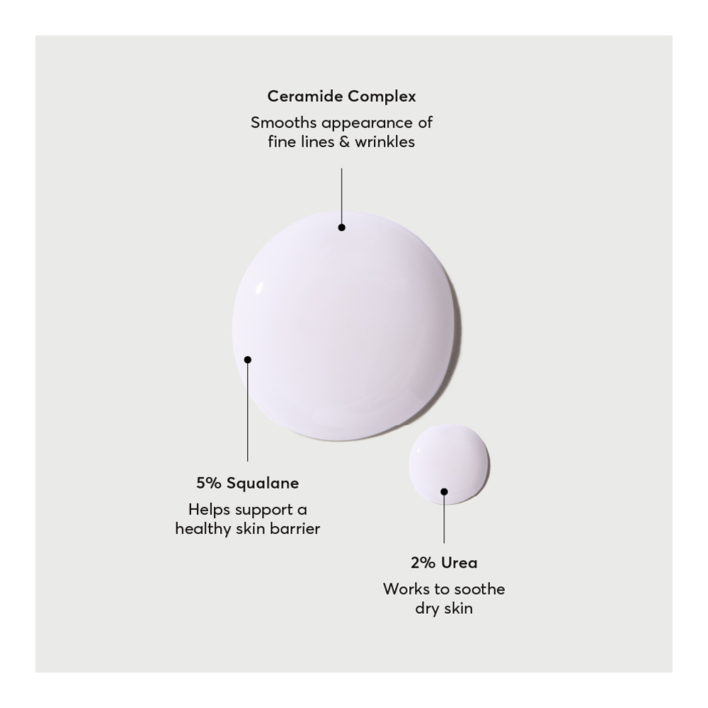 This nourishing formula plumps, brightens and hydrates skin for a glowing complexion. 2% urea works to sooth dry skin, with 5% squalane. Helps support a healthy skin barrier. Ceramide complex smooths look of fine lines and wrinkles.