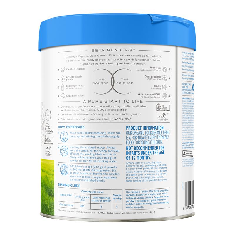 Bellamy's Organic Beta Genica-8™ Step 3 Toddler Milk Drink is an advanced premium nutrient dense milk made with the goodness of certified organic full cream milk with A2 protein. It combines the purity of certified organic ingredients with functional nutrition, supported by the latest in paediatric research. Professionally formulated to support active toddlers from 1 to 2 years of age, when dietary intake may be inadequate. An enriched alternative to ordinary cow's milk, it also contains essential fatty acid Omega 3 DHA (algal sourced), a premium synbiotic blend of Probiotic Bifidobacterium (BB-12®) and Prebiotics (GOS & FOS) as well as 12 essential vitamins and minerals to support the immune system and growth.