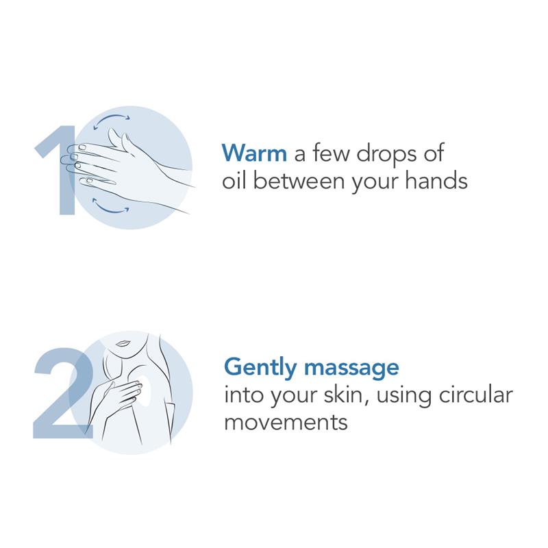 Directions Warm a few drops in between your hands. Gently massage into slightly damp skin using circular motions. Concentrate on the driest and flakiest areas of the body. Dress immediately after application.