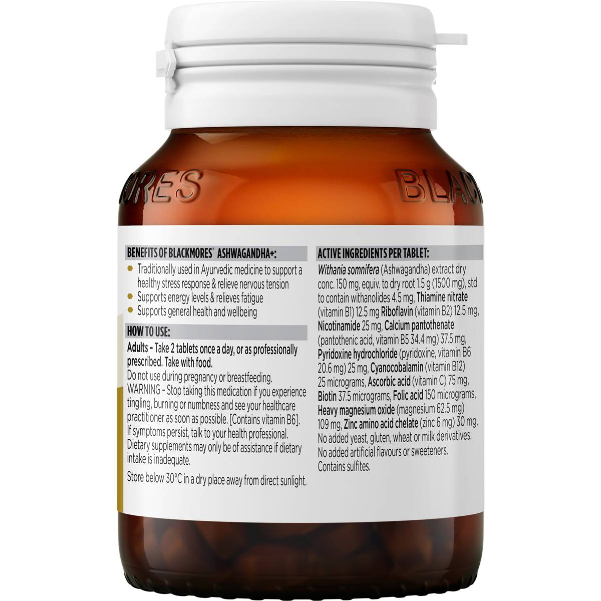 BLACKMORES ASHWAGANDHA+ is traditionally used in Ayurvedic medicine to relieve symptoms of stress & help the body to adapt to stress. BLACKMORES ASHWAGANDHA+ contains Ashwagandha - an adaptogen herb traditionally used in Ayurvedic medicine to relieve symptoms of stress & help the body to adapt to stress. Also used in traditional Ayurvedic medicine to support a healthy stress response in the body & relieve nervous tension. BLACKMORES ASHWAGANDHA+ also contains B vitamins to support energy levels, relieves fatigue and vitamins and minerals to maintain general health and wellbeing.BLACKMORES ASHWAGANDHA+ traditionally used in Ayurvedic medicine to:Relieve symptoms of stressHelp the body to adapt to stress.Supports a healthy stress response in the body & relieves nervous tension.Contains B vitamins to support energy levels & relieve fatigueMaintain general health and wellbeing.