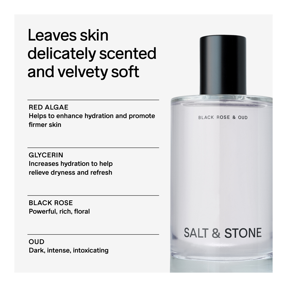 Discover an intoxicating and centering body mist in Salt & Stone’s signature scent, Black Rose & Oud. It’s infused with glycerin and red algae to leave skin feeling soft and hydrated. Immerse yourself in a sensorial experience, layering each product to create a complete body care routine in your favourite fragrance.