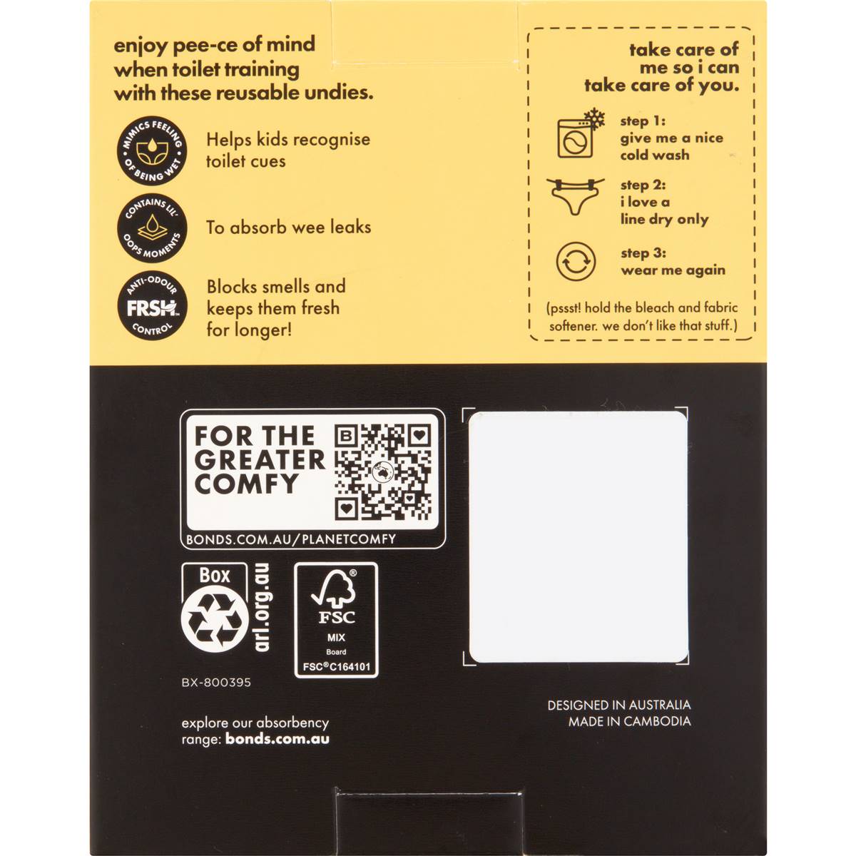 Bonds Whoopsies Toilet Training Undies help littlies feel like a ""big kid"". They're the perfect go-anywhere training undies to help them graduate from nappies to regular undies with confidence. Whoopsies toilet trainer undies perfect for wee little accidents Dual layer design ensures moisture management Odour inhibiting technology Stretchy cotton designed to feel like real undies Please note Girl, Boy & Unisex colour available. Please advise in your personal shopper notes your preferred colour or design when reviewing your order at checkout. The colour or design delivered is subject to availability.