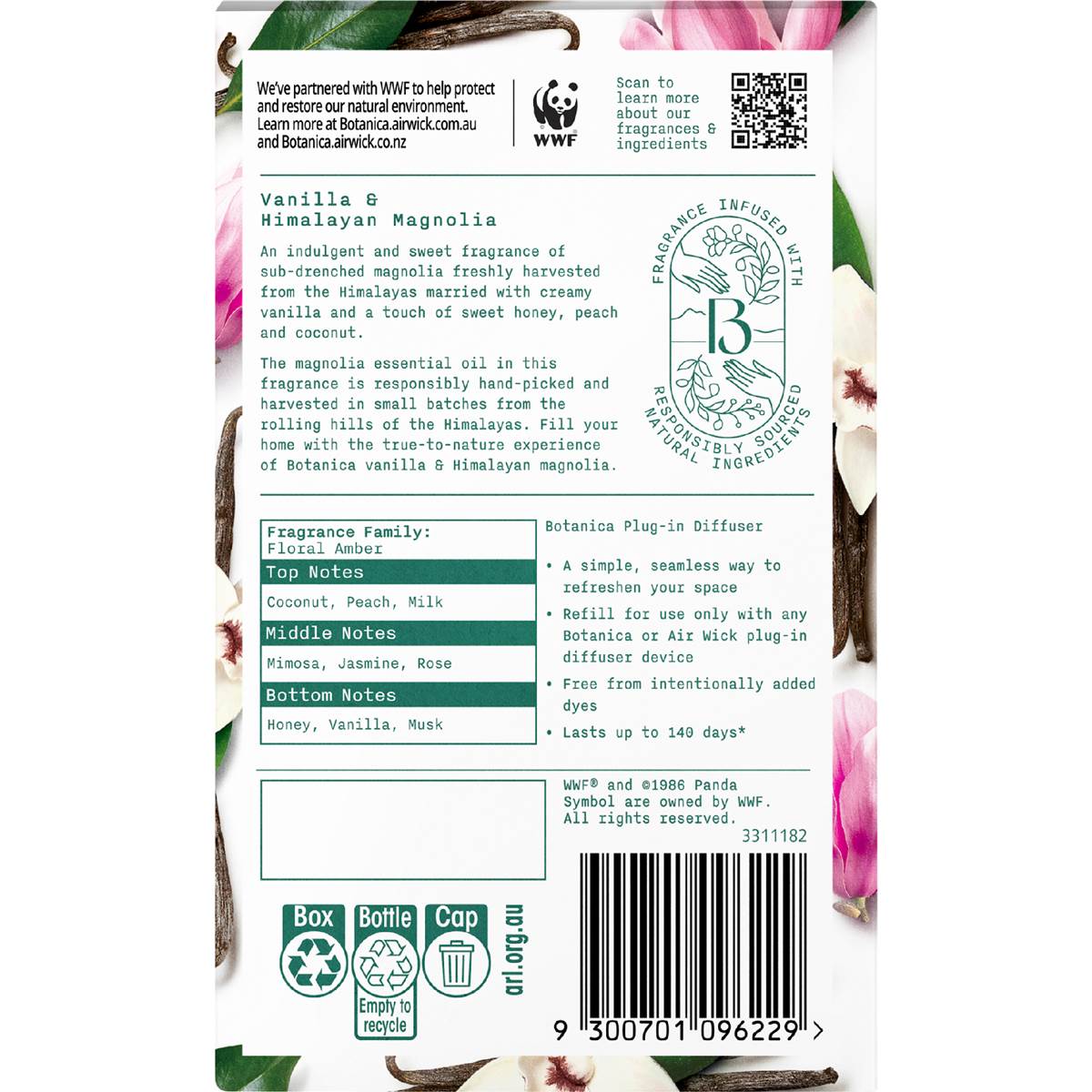 Botanica by Air Wick Vanilla & Himalayan Magnolia Plug-in Diffuser Pack is fragrance infused with responsibly sourced, natural ingredients. With up to 140 days (based on 12hrs daily usage, on minimum settings) of nature-inspired fragrance. Vanilla & Himalayan MagnoliaAn indulgent and sweet fragrance of sub-drenched magnolia freshly harvested from the Himalayas married with creamy vanilla and a touch of sweet honey, peach and coconut. The magnolia essential oil in this fragrance is responsibly hand-picked and harvested in small batches from the rolling hills of the Himalayas. Fill your home with the true-to-nature experience of Botanica vanilla & Himalayan magnolia.Fragrance infuse with responsibly sourced natural ingredients.Fragrance Family: Floral AmberTop Notes: Coconut, Peach, MilkMiddle Notes: Mimosa, Jasmine, RoseBottom Notes: Honey, Vanilla, MuskBotanica Plug-in Diffuser- A simple, seamless way to refreshen your space- Refill for use only with any Botanica or Air Wick plug-in diffuser device- Free from intentionally added dyes- Lasts up to 140 days (based on 12hrs daily usage, on minimum settings)