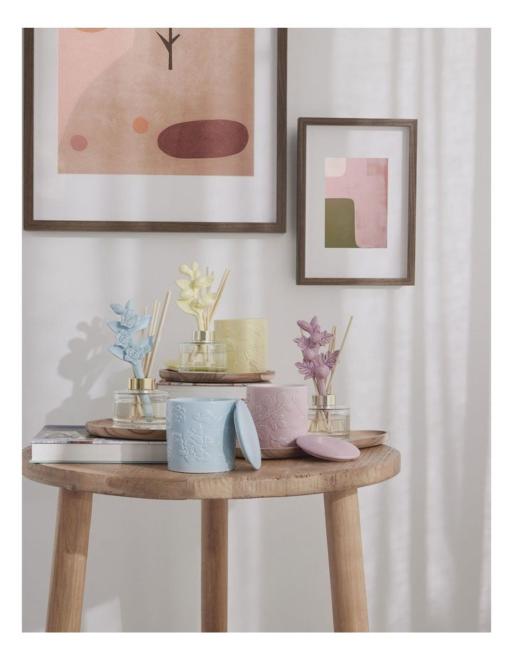 The fresh scent of gardenia, sweet frangipani, and earthy cedarwood evokes a tranquil garden after rain. Encased in debossed ceramic design.