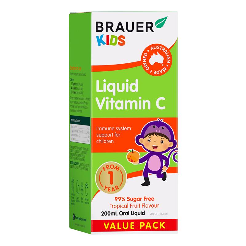 General Information Brauer's Liquid Vitamin C has been specially formulated to provide immune system support for children. 99% sugar-free and with a great fruity taste, Liquid Vitamin C is easy to administer and suitable for use from 1 year old! In children, vitamin C: - Supports healthy immune system function, and maintains general health and wellbeing - Supports skin health, assists teeth development, and supports healthy bone growth - Supports dietary iron absorption - Is an antioxidant, which helps reduce free radical damage to body cells Suitable For: Suitable from 1 year of age Boxed Contents: 200mL Oral Liquid Size: 200ml KEY FEATURES • Australia's Number 1 Liquid Vitamin C for Kids