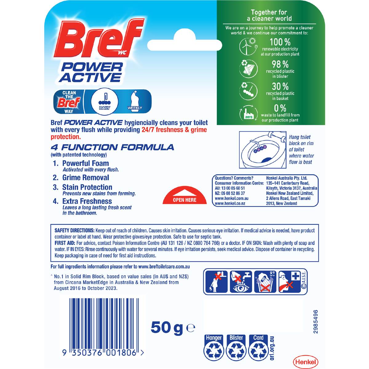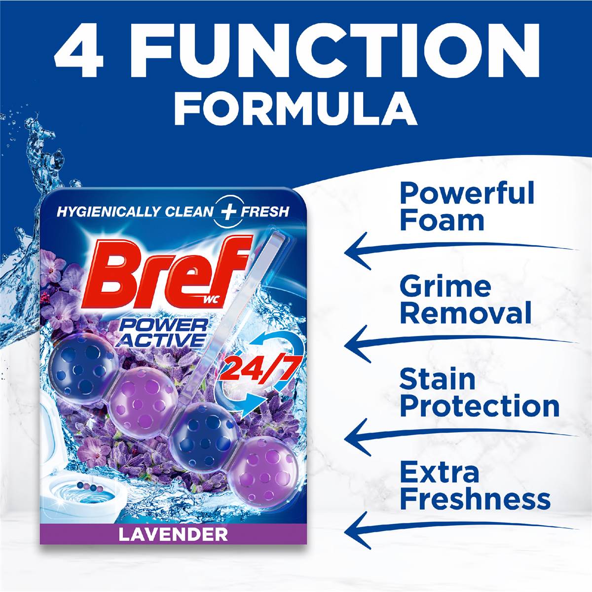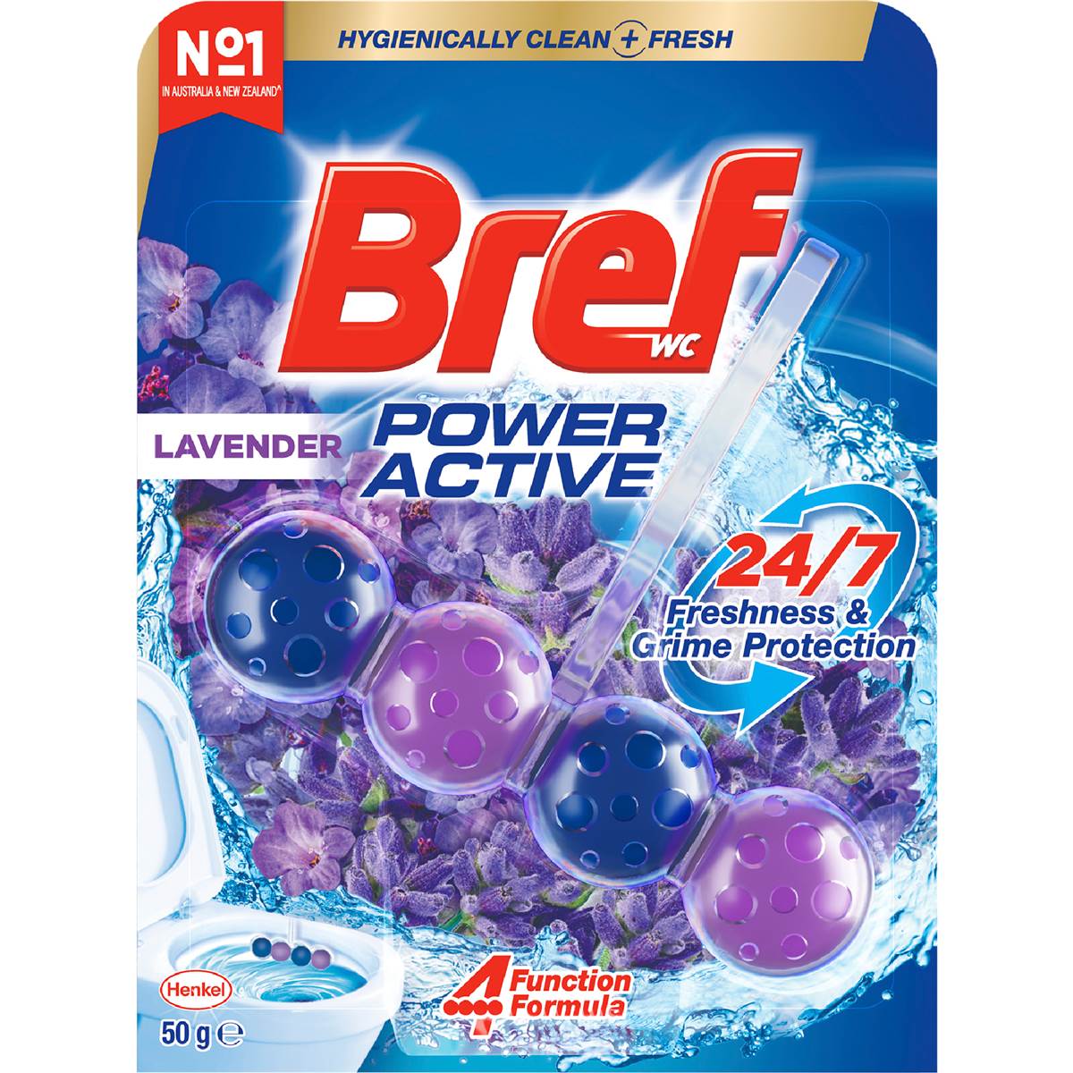 Bref Power Active with 4 Function FormulaToilet Foaming Cleanser(50g),Toilet Freshenerwith Lavender Scent, HangingToilet Bowl Cleanerto Deep Clean Toilet. Bref Power Active Toilet Cleaner (50g) - Septic safe toilet cleaner with Lavender scent Elevate your bathroom experience with Bref's Power Active's hanging toilet bowl cleaner. This toilet flush cleaner not only provides a deep clean with every flush but also infuses your bathroom with a wild lavender scent. This Bref toilet freshener is an effortless way to enhance your toilet and bathroom. Bref Power Active toilet stain remover featuring a powerful 4 function formula with patented technology: Power foam - clean your toilet with every flush Grime removal Stain protection - prevents new stains from forming Extra freshness - leaves a long lasting fresh scent in the bathroom Bref Power Active is incredibly easy to use. Simply leave the toilet bowl cleaner hanging on the rim of your toilet bowl where the water flows strongest. This heavy-duty toilet cleaner not only tackles existing tough toilet stains but also prevents new ones from forming. Explore other scents in the Bref toilet cleaner range, including Flower, Ocean, Lemon, and Hawaii, for an array of fragrance experiences. Together for a cleaner world – Our production plant operates on 100% renewable electricity with zero waste sent to landfills. The blister packaging consists of 98% recycled plastic while the basket contains 30% recycled plastic. Both the carton and basket are recyclable. To recycle, simply separate the carton from the blister package.Toilet care- Create your perfect bathroom with Bref Power Active 4 functiontoilet rim cleanerwhich releases a wild lavender fragrance and leaves your bowl sparkling 24/7 after every flush4-function formula – Thetoilet cleanerblock cleans the toilet with a powerful foam on every flush, while offering long-lasting freshness, removing grime, and preventing new stains from formingFresh scent – The long-lasting lavender fragrance of thisautomatic toilet bowl cleaneris released with every flush to ensure your toilet is fresh and pleasantly smelling at any timeSustainable packaging – The blister packaging is made of 98% recycled plastic and with 100% renewable energy at the production plant. The basket of thisBref toilet cleaneris made of 30% recycled plasticEasy to use – Simply hang theBref Power Active toilet cleaneron the rim of the toilet bowl and adjust to the water flow. Get it activated with the first flush to enjoy the 24/7 cleanliness and wild lavender freshness