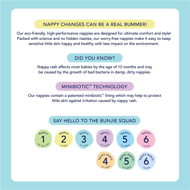 General Information Bunjie's eco-friendly, high performance nappies are designed for ultimate comfort and style! Packed with science and no hidden nasties, our worry-free nappies make it easy to keep sensitive little skin happy and healthy with less impact on the environment. Free from: latex, fragrance, synthetic dyes, chlorine, parabens, PEGs, SLS, EDTA, benzalkonium chloride, petrochemicals, nut oils, phenoxyethanol. Made with: prebiotics, probiotics and postbiotics, including plant-based lactobacillus. Our nappies are made from well-managed, sustainable forest materials which are kinder to our environment. Our nappies have been independently tested by Intertek and Dermatest to demonstrate their safety and exclusion of harsh chemicals and irritants, to help protect little bums against pesky skin irritation. Bunjie Baby products are carefully formulated to give little skin the best start to life. Suitable For: Sensitive & eczema prone skin Boxed Contents: Nappies Size: 52 Pack KEY FEATURES • Up to 12 hours leak proof • Wetness indicator • Hypoallergenic • Non-toxic & plant-based • Minibiotic™ technology