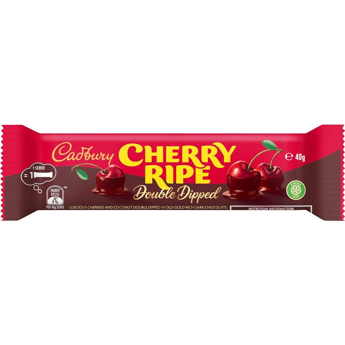Cadbury Cherry Ripe Double Dipped contains cherries and coconut double dip in Old Gold dark chocolate.Enjoy the Big Cherry Taste. The ripe juicy cherries and moist coconut smothered in Old Gold rich dark chocolate ensures a unique taste experience. Cherry Ripe offers an indulgent and rich treat.Luscious cherries and coconut double dipped in Old Gold rich dark chocolate