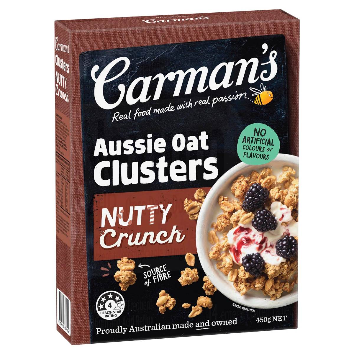 Breakfast Time... Anytime!Simply crafted from whole grain Aussie oats, crispy puffed rice & real nutty deliciousness...Our baked clusters are the perfect balance of crunchiness & sweetness in every spoonful. Top with yoghurt and blackberries (just like the bowl we've created) or simply snack on them straight from the box. You'll love the crunch!No artificial colours or flavoursSource of fibre4 health star rating