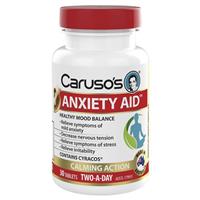 General Information Caruso's Anxiety Aid helps to promote a feeling of calm and relaxation, assisting in the management of mild anxiety and helping with adaptation to stress. The formula helps to relieve restlessness and excess nervous tension or energy, supporting healthy mood balance. Caruso's Anxiety Aid helps to ease the symptoms associated with mild anxiety, stress and nervous tension. The unique ingredient Cyracos® is an extract of the herb Melissa officinalis, commonly known as Lemon balm. Caruso's Anxiety Aid contains a mixture of herbs, which may help relieve the symptoms of mild anxiety and stress. Size: 30 Tablets KEY FEATURES • Relieve symptoms of mild anxiety. • Decrease nervous tension. • Relieve symptoms of stress. • Relieve irritability. • Supports healthy mood balance and emotional wellbeing. • Convenient 1 a day tablet.