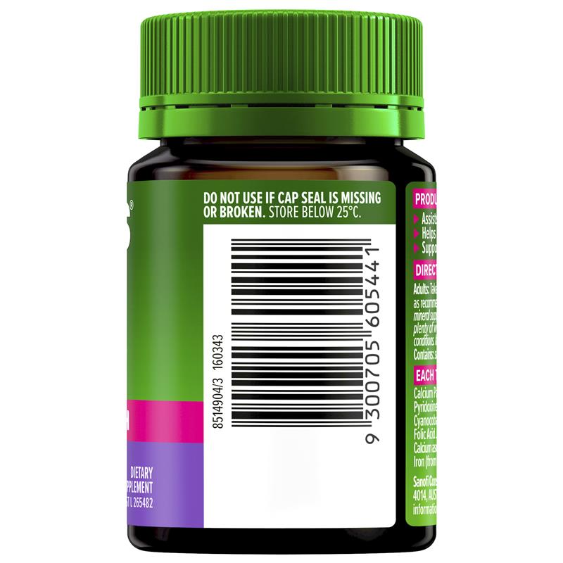 General Information Cenovis Iron Plus relieves fatigue and tiredness Cenovis Iron Plus tablets are formulated with iron, folic acid, vitamin C, vitamin B5, Vitamin B6, and vitamin B12. Our comprehensive iron complex maintains iron within the normal ranges-ideal for those who want to supplement their daily iron intake. Not only does this iron complex supplement support energy levels, but it also assists iron absorption and helps support hemoglobin formation. Proudly Australian Made® by Cenovis, trusted by Australian families for over 80 years, Cenovis Iron Plus tablets are quality tested during manufacturing to ensure product consistency and potency. Cenovis Iron Plus tablets contain no added gluten, lactose, sugar, artificial colours or flavours, artificial sweeteners, dairy products or animal-derived products.* Adults, take 1 to 2 tablets daily with food to supplement iron or as recommended by your healthcare professional. Vitamin supplements should not replace a balanced diet. Drink plenty of water. Not for the treatment of iron deficiency conditions. If symptoms persist, see your healthcare professional. Always read the label and follow the directions for use. *Contains sulfites. Suitable For: Adults take 1 tablet daily with food to supplement iron or as recommended by your healthcare professional. Size: 80 Tablets KEY FEATURES • SUPPORTS ENERGY: Helps maintain energy levels • AIDS HAEMOGLOBIN SYNTHESIS: Cenovis Iron Plus supplement maintains iron levels in the body and helps support haemoglobin formation • SUPPORTS IMMUNE SYSTEM FUNCTION: Supports healthy immune system function • SUPPORT: Cenovis Iron Plus supplement also contains Folic Acid, Vitamins C, B5, B6, & B12 • NO ADDED: Gluten, lactose, sugar, artificial colours, artificial flavours, artificial sweeteners, dairy products or animal-derived products • Always read the label and follow the directions for use. See product warnings below.