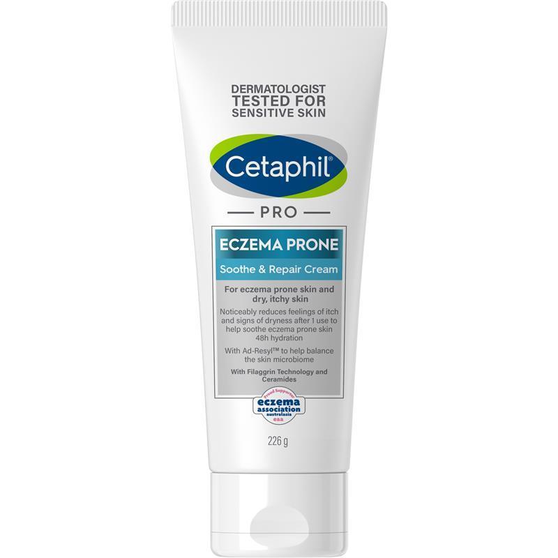 General Information Cetaphil Pro Eczema Prone Soothe & Repair Cream is a rich cream to help relieve and instantly soothe very dry, itchy and eczema prone skin after 1 use. Cetaphil Pro Eczema Prone Soothe & Repair Cream is a rich cream to help relieve and instantly soothe very dry, itchy and eczema prone skin after 1 use. This unique cream is clinically proven to help repair the weakened skin barrier within 24 hours and strengthen the skin moisture barrier to help improve skin resilience over time. Dermatologist developed formula with science-backed ingredients including Filaggrin Technology to lock in hydration and help improve skin resilience, Ceramides to help restore the damaged skin barrier with 48 hour hydration and AD-Resyl™ to help balance the skin microbiome. 94% agreed cream provided instant relief for dry, itchy, eczema-prone skin1 1. Galderma data on file RD.53.SPR.205147 - In Use Test Suitable For: All ages including infants and adults. Size: 226 Shelf Life in Days: 1095 KEY FEATURES • Clinically proven to lock in moisture and hydrate dry, itchy skin for 48 hours. • Dermatologist Tested - Suitable for babies to adults. • Clinically proven to significantly start to repair the skin's barrier in 24 hours and relieve dry, itchy skin after just 1 use. • Can be used on Face & Body • Fragrance free, non-comedogenic • Proud supporter of the Eczema Association of Australasia