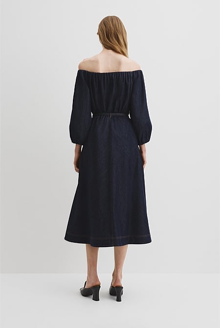 This midi skirt is made in lightweight denim fabric and is designed in a full silhouette. It has a wrap front with tie closure, side pockets and contrast top stitching to add a subtle design accent. Amanda is 179cm tall with a 79cm bust and 61cm waist and wears a size XS/8.