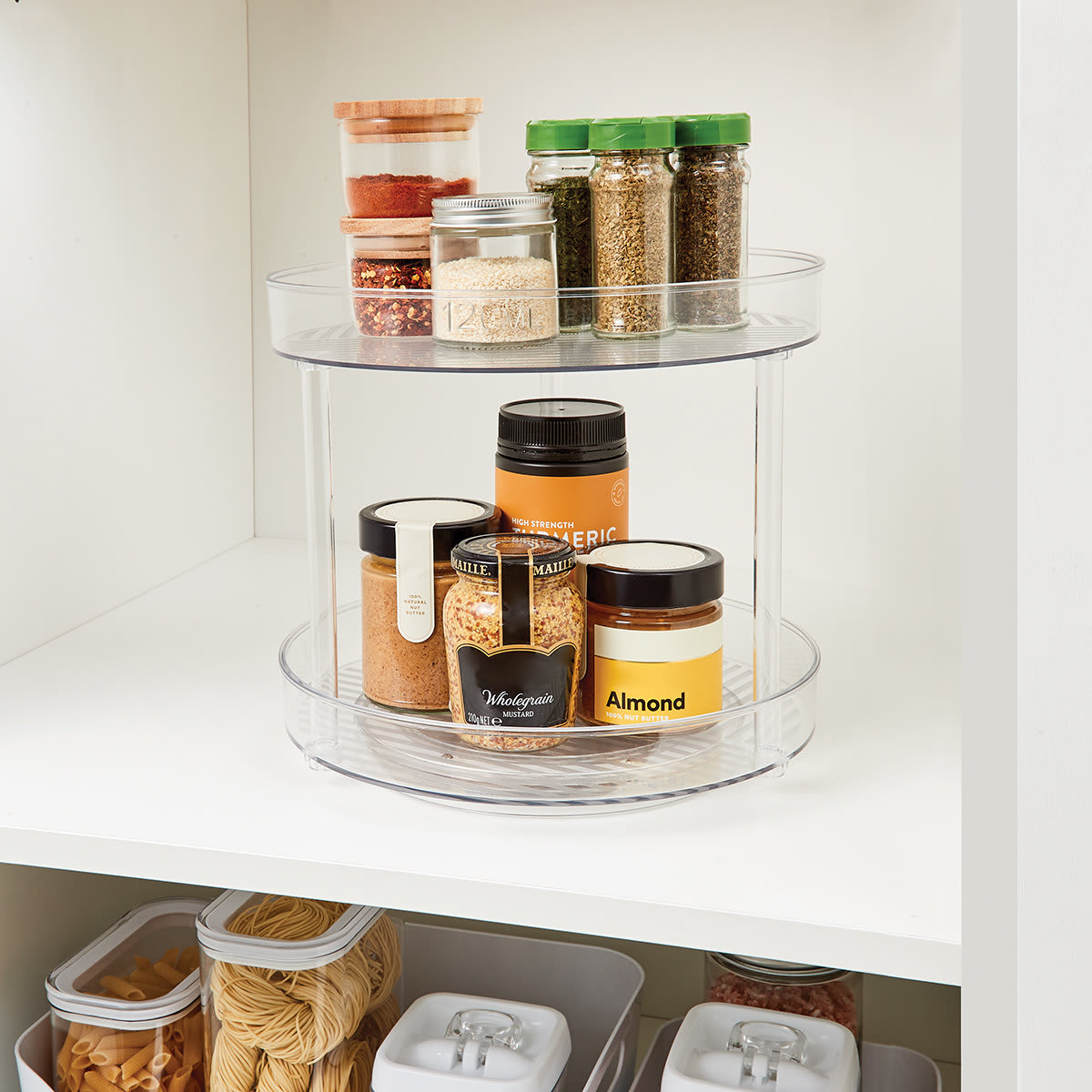 The Clear 2 Tier Turntable provides a practical solution for organising pantry essentials while keeping them within easy reach. Its multi-level design helps maximise space and maintain a tidy kitchen.The two-tier structure allows for efficient storage, making it easy to arrange and access jars, bottles, or condiments without cluttering shelves.The smooth-turning mechanism lets you effortlessly reach items at the back, ensuring all stored goods remain visible and easily accessible.Suitable for kitchen cabinets, countertops, or pantry shelves, this turntable is ideal for organising spices, sauces, or snacks in one convenient place.Designed for hassle-free upkeep, the smooth surface allows for quick wiping, keeping it looking fresh while maintaining hygiene in the kitchen.