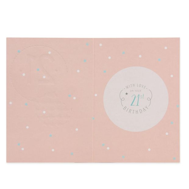 202, The inside of the card features an illustration with polka dots, flourishes and a star alongside the message 'WITH LOVE ON YOUR 21ST BIRTHDAY'