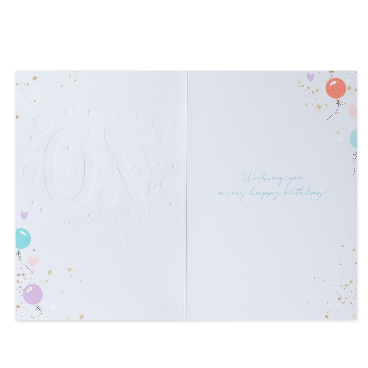 The front of the card features gold foil highlights, embossed elements, illustrations of balloons surrounded by love hearts and gems and the message '70 Today Wonderful Always'