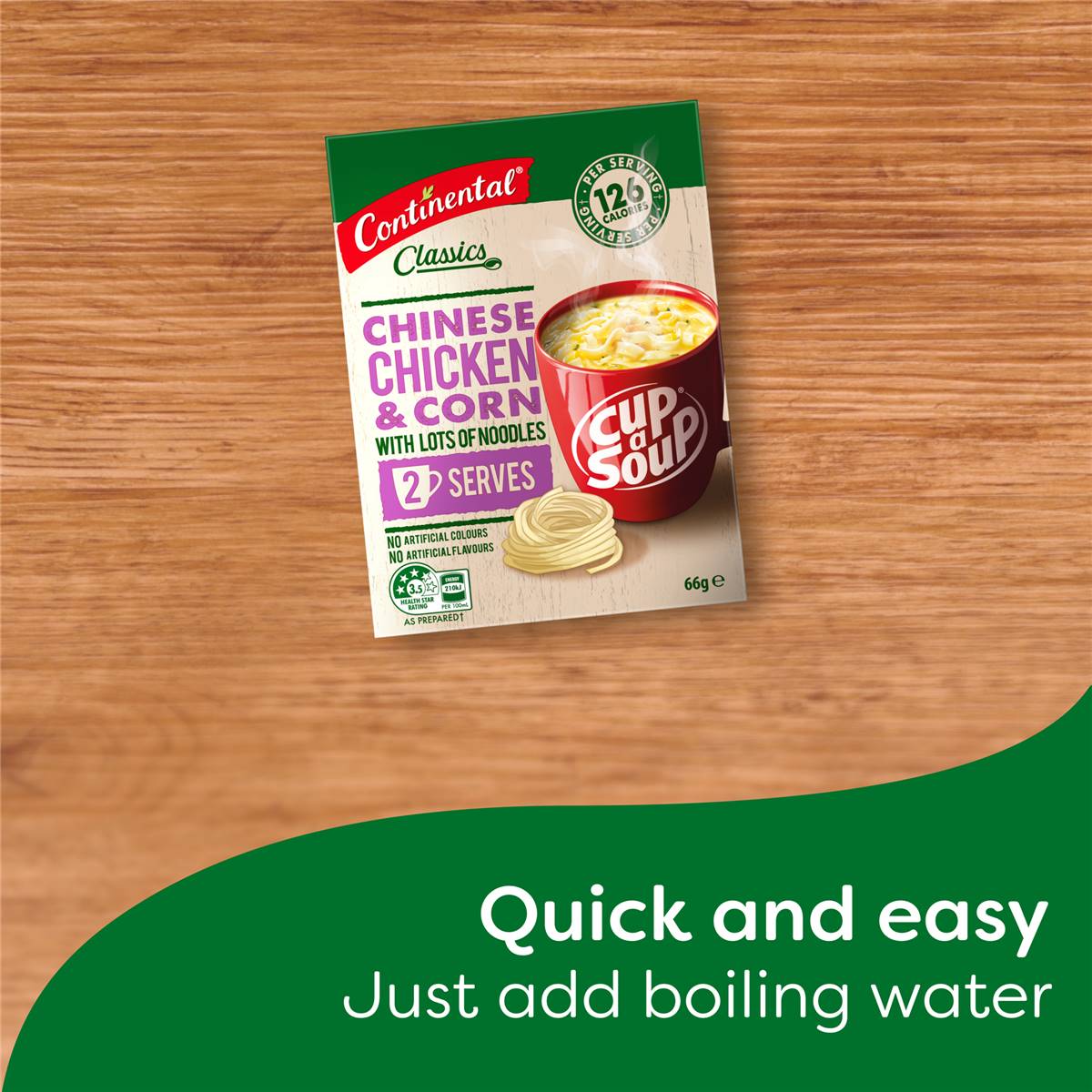 Continental Classics Cup A Soup Chinese Chicken & Corn With Lots Of Noodles 66 gIndulge in Continental Classics Cup A Soup Chinese Chicken & Corn With Lots Of Noodles – a delightful, hearty meal conveniently packed in a single packet. Made with quality ingredients and noodles, it's a speedy and effortless choice, ideal for those hectic days. Our tasty and warming Chinese Chicken & Corn Noodle Soup is proudly made in Australia using sustainably grown wheat – with no artificial colours or flavours. Savour the rich and authentic flavours that are sure to satisfy your cravings, with only 126 calories per serving.At Continental, we love food the way you do. We know how much you value good, nutritious, flavourful food and real authentic home cooking. It feels good to cook and even better to bring pleasure to the ones you love through the food you put on the table. For over 70 years, our chefs have combined their expertise, love of flavour and only the finest ingredients to help you create great-tasting snacks and meals every day. Be surprised by how easy and tasty it can be with Continental’s Classics Soups. Enjoy the endlessly delicious possibilities straight from your pantry. Visit our website to explore the full Continental Classics Cup A Soup range.Enjoy the delightful flavour of Continental Classics Cup A Soup Chinese Chicken & Corn With Lots Of NoodlesWith just 126 calories per serve, this noodle soup makes the perfect snack or an easy addition to any mealThis chicken and corn soup contains no artificial colours or flavours and is proudly made in Australia with sustainably grown wheatContinental Cup A Soup has a 3.5 Health Star RatingJust add boiling water and stir continuously for 15–20 seconds to enjoy this delicious, warming cup of soupAt Continental, we combine dried vegetables, herbs and spices to ensure each soup makes a tasty snack or meal, every time