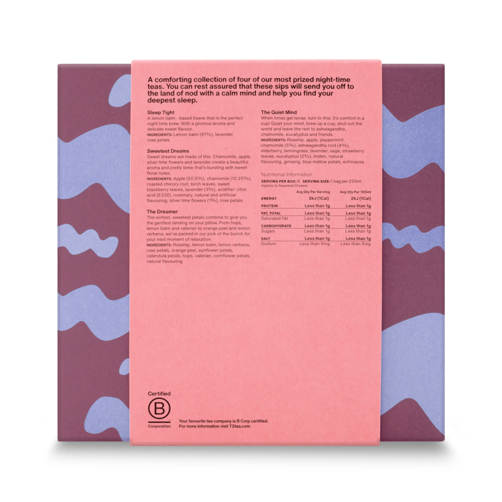A comforting collection of four of our most prized night-time teas. You can rest assured that these sips will send you off to the land of nod with a calm mind and help you find your deepest sleep. 32 caffeine-free tisane teabags in individual sachets ¬– Sleep Tight, Sweetest Dreams, The Dreamer and The Quiet Mind. Packed into a colourful, recyclable cardboard box. Perfect to gift or keep for yourself. This pack will help calm your mind to find your deepest sleep. From fruits to spices, tea leaves to herb bushes, 100% of our tea is sustainably sourced. Our teabags are made from food-grade corn starch - they are compostable, too. What's in the box? Contains 32 x tisane tea bags in sachets 8 x Sleep Tight 8 x Sweetest Dreams 8 x The Dreamer 8 x The Quiet Mind