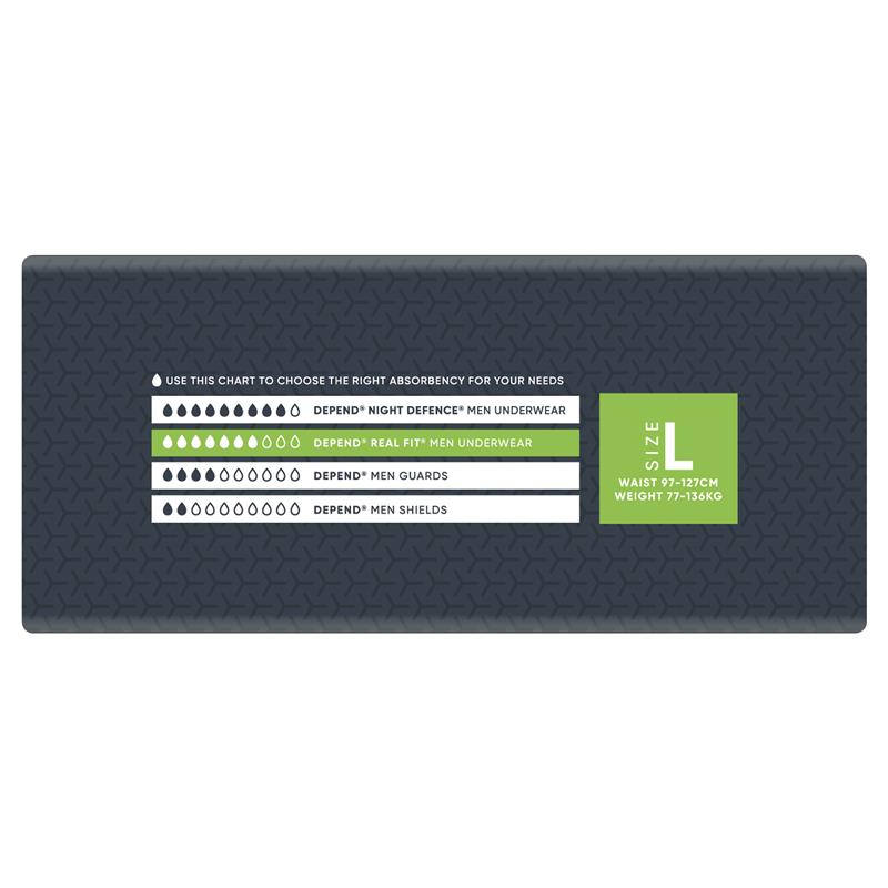 General Information Depend Real Fit disposable underwear for men is designed for discreet, maximum absorbency protection. 3-in-1 protection offers worry-free odour control, fast absorption and a discreet, comfortable fit. Depend Real Fit Underwear for men is specifically designed to fit and feel like real underwear and protect against heavy bladder loss with all-around leg elastics for leakage protection. Size: 16 Pack KEY FEATURES • Fast Absorbtion - Fast absorbtion for protection against heavy bladder loss. • Discreet Fit - Fits and feels like real underwear. • Odour control - Worry-free odour control. • Stays Put - Strong adhesive locks in place. • Gender Specific - Designed for men, with added protection where you need it most.