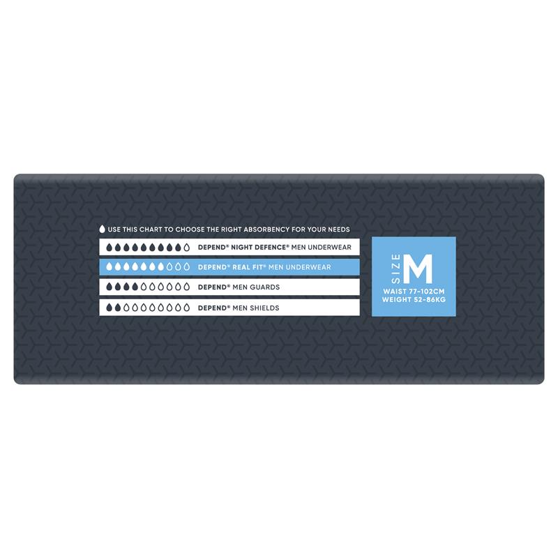 General Information Depend Real Fit disposable underwear for men is designed for discreet, maximum absorbency protection. 3-in-1 protection offers worry-free odour control, fast absorption and a discreet, comfortable fit. Depend Real Fit Underwear for men is specifically designed to fit and feel like real underwear and protect against heavy bladder loss with all-around leg elastics for leakage protection. KEY FEATURES • Fast Absorbtion Fast absorbtion for protection against heavy bladder loss. • Discreet Fit Fits and feels like real underwear. • Odour control Worry-free odour control. • Stays Put Strong adhesive locks in place. • Gender Specific Designed for men, with added protection where you need it most.