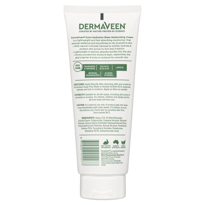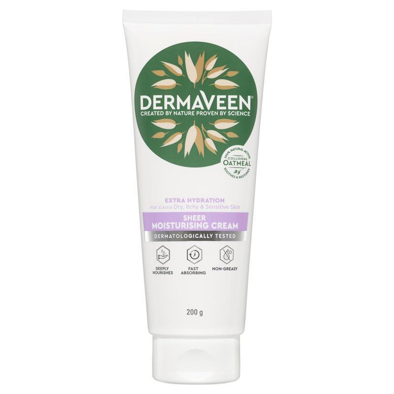 General Information DermaVeen Extra Hydration Sheer Moisturising Cream for extra dry, itchy & sensitive skin is dermatologically tested and non-greasy. 100% natural active colloidal oatmeal that soothes & restores. DermaVeen® Extra Hydration Sheer Moisturising Cream is a lightweight and fast absorbing moisturiser that restores resilience and smoothness to dry & sensitive skin. - With natural Colloidal Oatmeal to soothe, hydrate & protect skin prone to itch and irritation. - Lightweight in texture, absorbs quickly into the skin. - Forms a protective moisture layer, replenishes the skin's barrier & locks in moisture for smooth skin. Free from fragrances & parabens, sulfates, SLS & SLES, artificial colour & dyes, alcohol (ethanol). Not tested on animals. Suitable For: Vegan friendly. Suitable for all skin types, including skin prone to dermatitis or eczema. For infants, children and adults and for all-over body and face use. Product Claims: Free from fragrances & parabens, sulfates (SLS &SLES), lanolin, artificial colour & dyes, alcohol (ethanol). Not tested on animals. Size: 200g Fragrance Free?: Yes Dermatologist Tested?: Yes Skin Type: Dry| Sensitive Alcohol Free?: Yes KEY FEATURES • Deeply Noiurishes • Fast Absorbing • Non-greasy