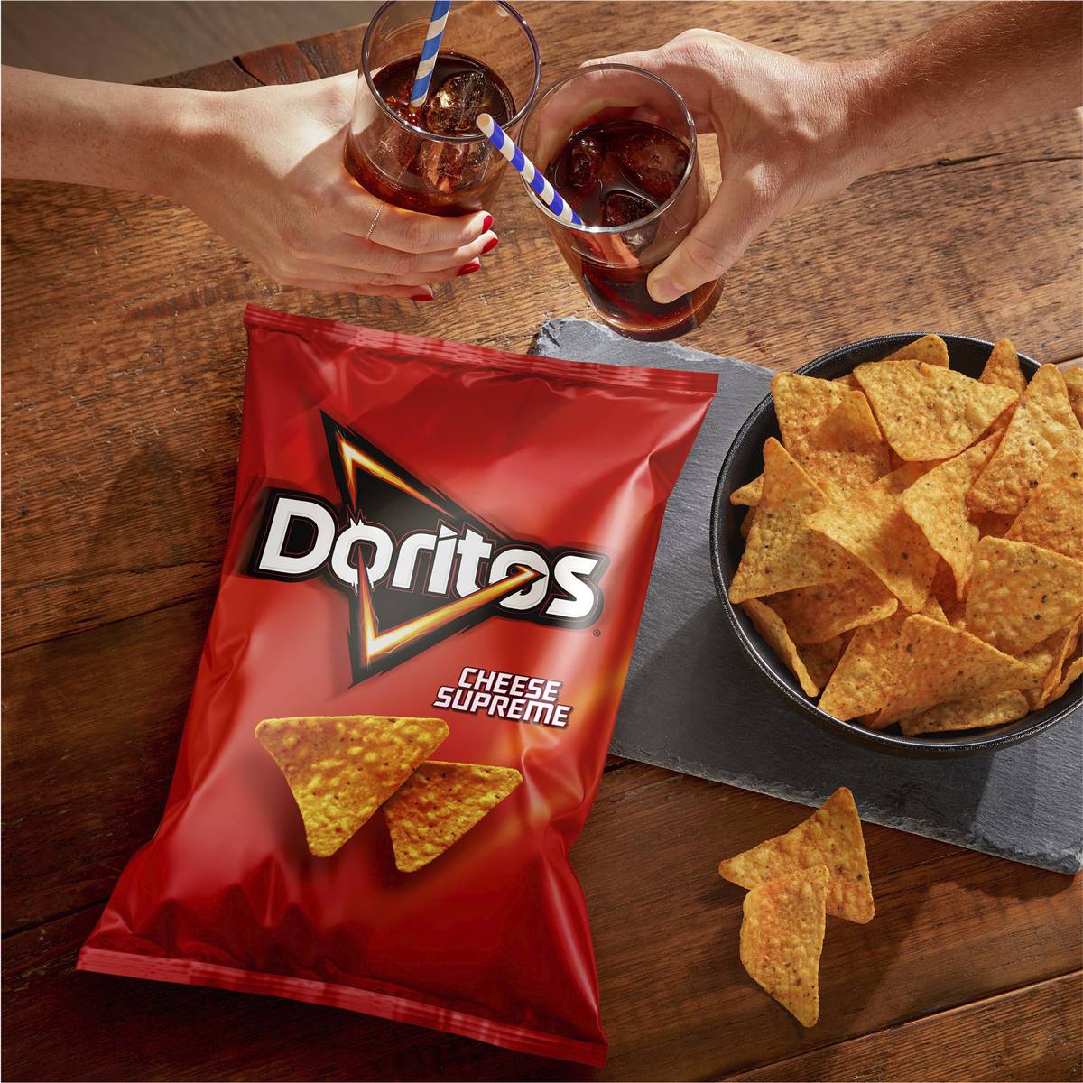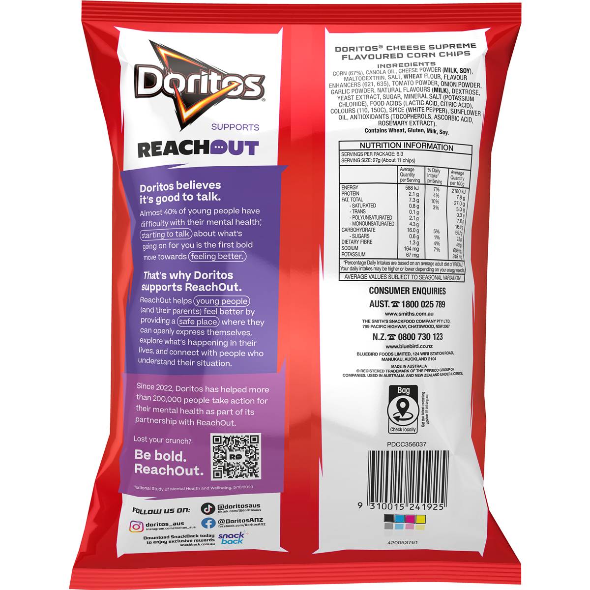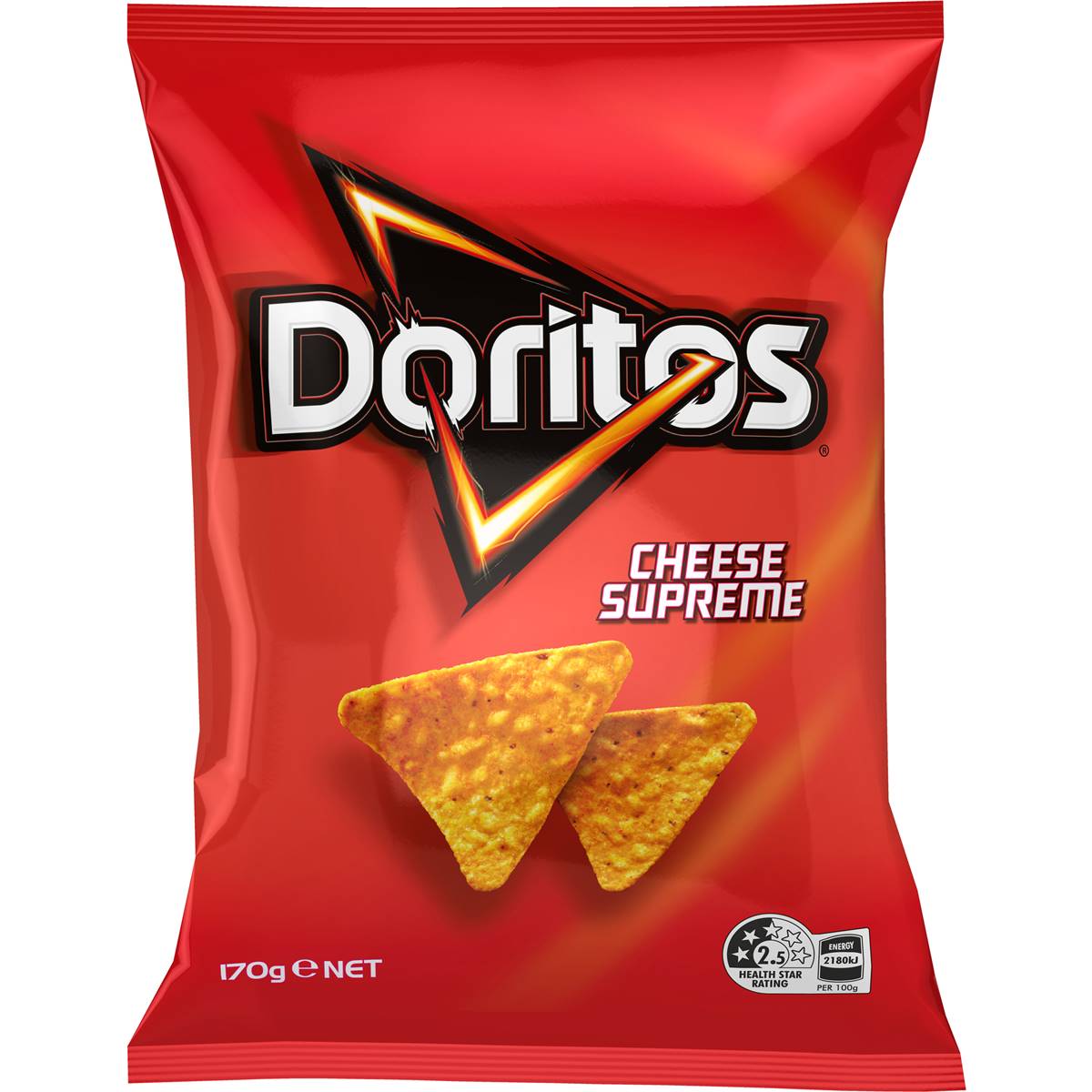 Bold Cheese Snacks with Unmistakable Crunch There’s nothing quite like the cheesy tooth-rattling crunch of Doritos Cheese Supreme corn chips. These high-quality corn tortilla chips are exploding with a bold cheesy flavour that’s sure to pack a flavourful punch.Doritos are a cheese-flavoured chip loved by millions around the world for that intense cheesy flavour that’s certain to inspire and arouse adventure.Perfect for Entertaining CompanyWhether you’re looking for that flavoursome fan-favourite to bring along to a gathering or looking to fuel your late-night gaming grind, this triangular gen-z icon never fails to excite.Chips? Nachos? Anything.In fact, it's so good that it makes a fantastic addition to your meal as a seasoning or even just to give your dinner that extra crunch factor.Want to Doritos-fy your favourite dishes? Maybe a Doritos Mac & Cheese for that oh-so-satisfying crunch or an even cheesier toastie with our mind-boggling seasoning?Check out our snazzy recipe and guide videos below for meal hacks that will tickle everybody’s tastebuds:https://doritos.com.au/meal-hacks-doritos-recipesAll you need is a packet of Doritos Cheese Supreme Corn Chips and be bold enough to take the challenge on.The Boldest of Cheese SnacksRest assured, Doritos are made in Australia from carefully selected ingredients that provide you with the unmistakably bold flavour we all know and love.The only thing you need to worry about is whether there’ll be enough to go around!The only love triangle you’ll ever want or need.Made in Australia from carefully selected ingredients for that bold Doritos flavour and unmistakable crunch.They make a fantastic addition to your meal as a seasoning or even just to give your dinner that extra crunch factor.Our Share Packs are made for entertaining, whether it’s at parties with friends or family gatherings.Looking for a late-night snack to fuel your gaming grind? Doritos checks all the boxes.They’re the ideal snack to keep you satisfied on the couch watching Netflix or at the computer browsing twitch.