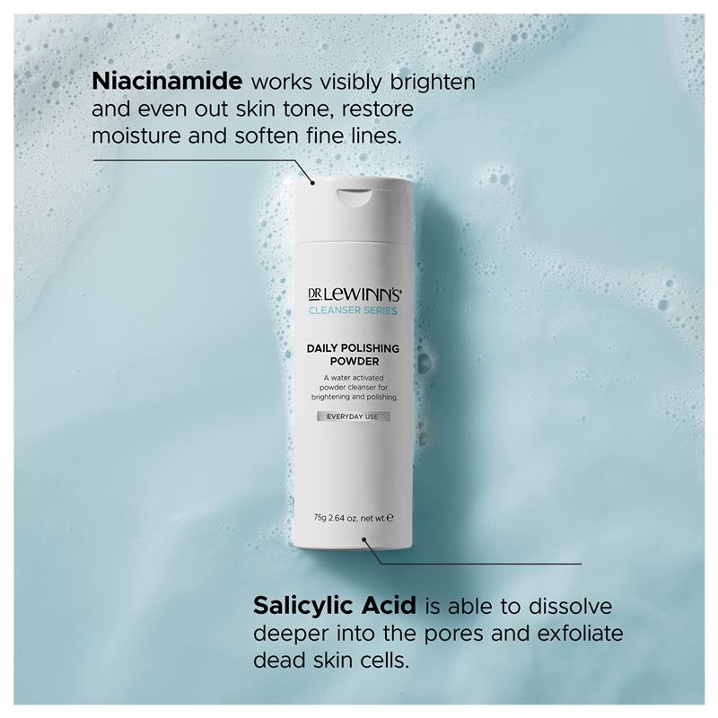 General Information A mild amino-based powder cleanser that contains physical and chemical exfoliants to instantly polish and resurface skin. Gentle enough for everyday use, it contains Niacinamide and Salicylic Acid. Niacinamide works to visibly brighten and even out skin tone, restore moisture and soften fine lines and Salicylic Acid is able to dissolve deeper into the pores and exfoliate dead skin cells. Key Product Features: -- Removes dulling surface debris and evens skin tone -- Polishes skin to perfection, revealing brighter, smoother skin while gentle enough for everyday use -- Prepares skin for optimum penetration of serums and treatment products -- Suitable for sensitive skin -- Dermatologically Tested 75g Suitable For: Suitable for all skin types including sensitive skin Product Claims: Works with your skin to visibly brighten and even out skin tone, restore moisture and soften the appearance of fine lines. Recommended By: Dermatologically tested Boxed Contents: 75g Size: 75g Dermatologically Approved?: Yes Shelf Life in Days: 12 months KEY FEATURES • Suitable for all skin types including sensitive skin • Dermatologically Tested • Suitable for everyday use • Bottle and cap is made from 50% PostConsumer Recycled PP Material • Contains physical and chemical exfoliants • Amino-based powder cleanser • Instantly resurfaces and polishes the skin for a smoother, brighter complexion