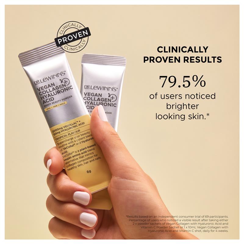 General Information Dr. LeWinn's Inner Beauty Vegan Collagen Powder contains 2000mg VeCollal™ a plant-based (vegan) collagen alternative driven by science and inspired by responsible innovation that works by mimicking Type 1 human collagen and vegan form of 50mg Hyaluronic Acid and Vitamin C. Skin-friendly nutrients to help nourish, hydrate and promote a healthy complexion from the inside out. Our expertly developed powder is suitable for Vegans and Flexitarians, supporting healthy skin, hair and nails. Collagen is the most abundant protein in the body and the main structural protein found in the skin. Collagen formation is an important structural protein found in the skin. Collagen formation is important for skin function, including skin hydration and firmness. Over time, the body's ability to produce collagen starts to slow and these effects can be most noticeable through our hair, skin and nails. With a great tasting tropical flavour, 100% Vegan, blend 1 sachet into 250mL of water, or stir in into your favourite juice or smoothie or mix into your choice of food, up to 2 times a day. Consume immediately after preperation. Do not exceed 2 serves per day. Gluten Free and dairy free. Responsible innovation. Suitable for all Vegans and Flexitarians. Size: 30 X 6g KEY FEATURES • Vegan • Flexitarian • Gluten Free • Dairy Free • Wheat Free • Collagen • Hyaluronic Acid • Vitamin C