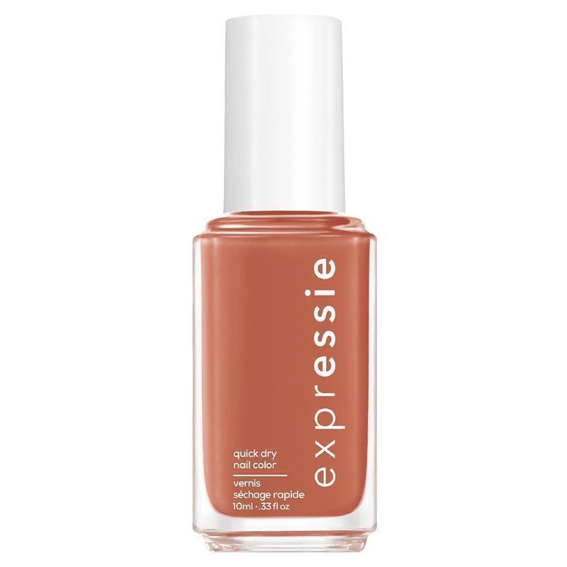 General Information a burnt orange quick dry nail polish. grab it before it's gone. in a flash sale the first thing we're adding to our carts? this burnt orange quick dry nail polish. expressie; the only quick dry nail polish worthy enough of carrying the essie name. Expressie dries in about a minute so you can grab, try and apply on-the-fly. Featuring a salon quality 8-free, vegan formula, formulated with no animal-derived ingredients. Our first-ever, patented angled brush allows for easy application with both hands. An unconventional range of shades to express yourself in every moment. Seize the minute, wait for nothing. Size: 10ml KEY FEATURES • expressie, by essie, is our quick dry on-the-fly nail polish. • One step colour and shine formula dries in about a minute so you can grab, apply and dry on the fly. • expressie is an 8-free, vegan formula, formulated without the following ingredients: toluene, formaldehyde, formaldehyde resin, camphor, ethyl tosylamide, dibutyl phthalate, xylene, triphenyl phosphate and no animal-derived ingredients. • Our first ever angled brush for easy self-application with both hands, including your non-dominant hand. • Express yourself with a range of unconventional, trans-seasonal fast drying nail polish colours.