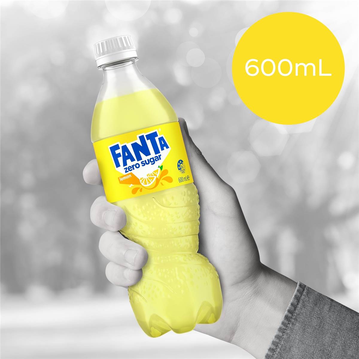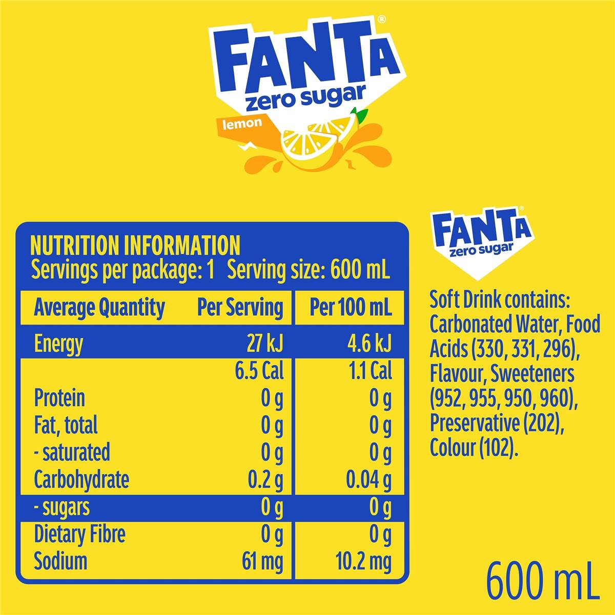 Fanta Lemon Zero Sugar Soft Drink 600mL BottleBubbly and refreshing, Fanta Lemon Zero Sugar is a sparkling soft drink with delicious lemon flavour, and zero sugar. Perfect for pairing with a snack or meal.Delicious Lemon Flavour