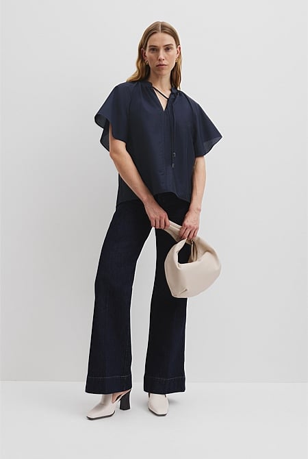 Made using a lightweight cotton-silk blend, this blouse drapes in a relaxed silhouette with statement flutter sleeve. It features a collar stand with V-neckline, soft gathers and is finished with a self tie at the neck. Ayen is 178cm tall with a 81cm bust, 61cm waist and 89cm hips and wears a size XS/8. Linnea is 175cm tall with a 86cm bust, 67cm waist and 93cm hips and wears a size XS/8.