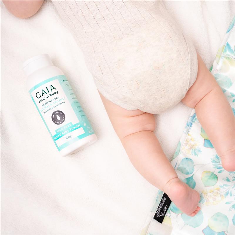 GAIA Natural Baby Powder contains Cornstarch helps to absorb excess moisture and keep your baby's bottom, and skin folds fresh and dry. Contains organic lavender to soothe and calm skin.Suitable For: Baby