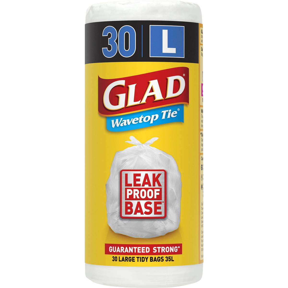 Glad Wavetop Tie Bags with Leak Proof BaseGlad Wavetop Tie Bags are reliable and strong with a unique 4-way tie system that makes them easy to tie up and carry out. The Wavetop Tie enables the bags to be closed securely even when they’re full and the Leak proof base means they won't drip when you’re carrying them out. -Reliably Strong- 4-Way Tie System- Leak Proof Base